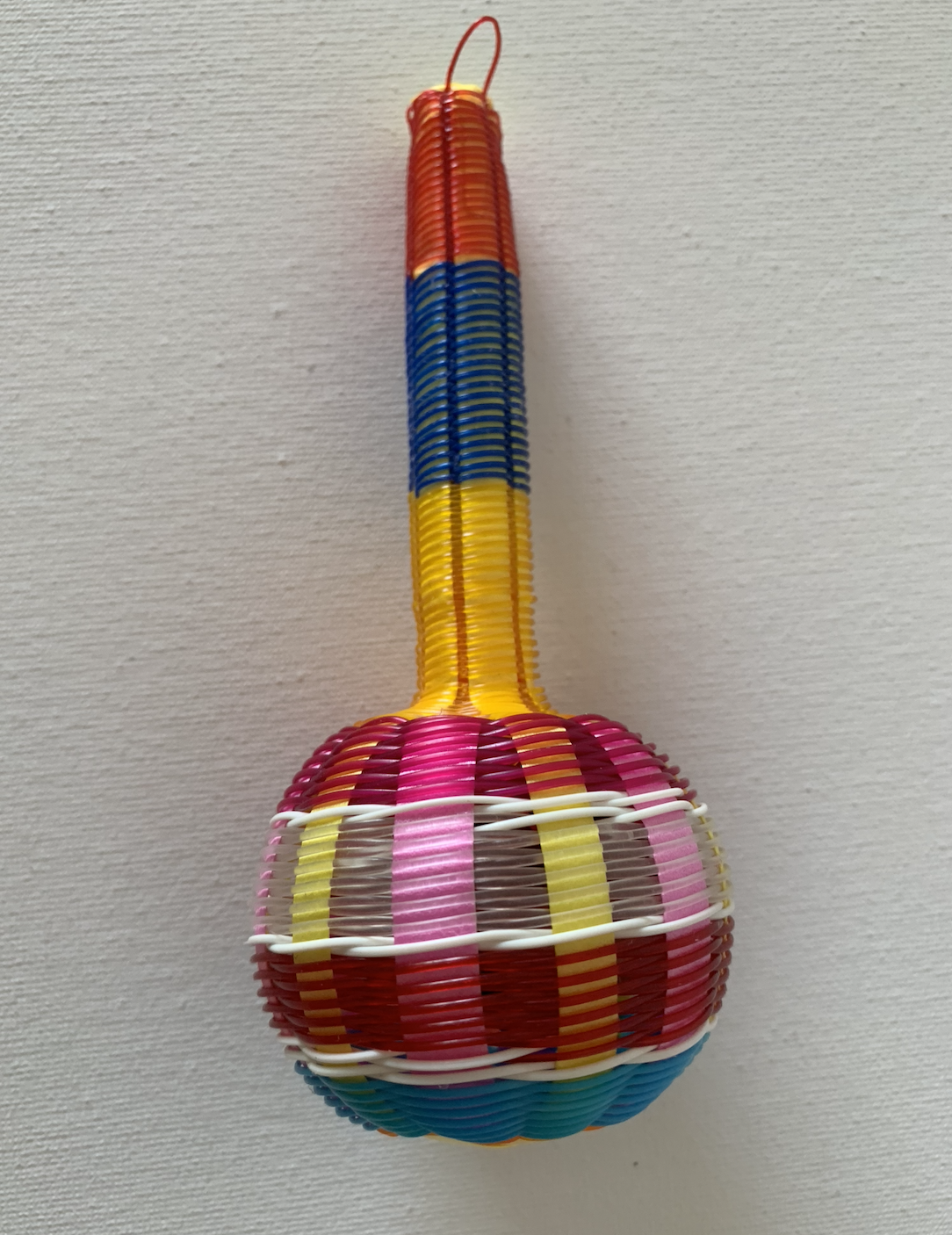 Se trata de una sonaja para bebés que al agitarse o golpearse con la mano suenan sus cascabeles, composición tejido con yute de colores.